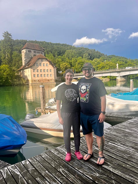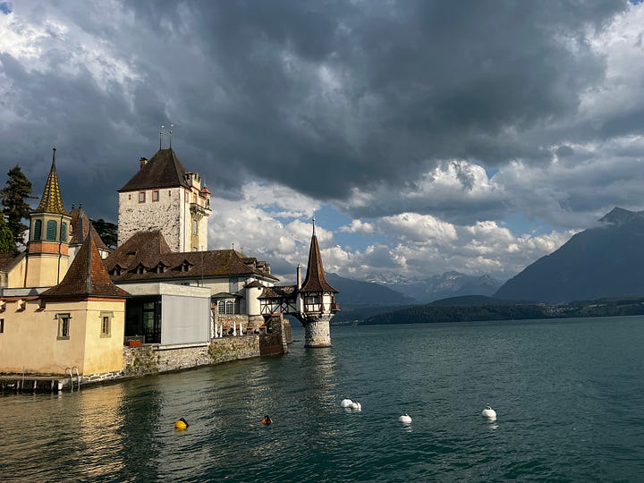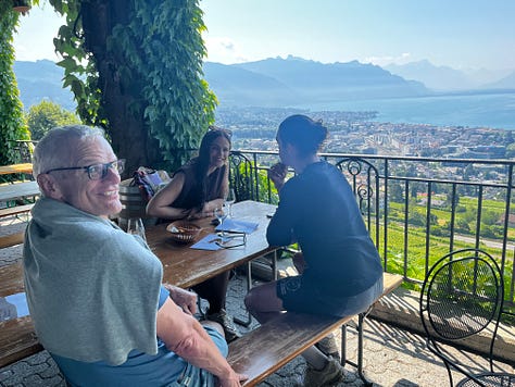 For three weeks, our lives brimmed with young people. The berries I picked, I shared. My early morning house, I shared. And our gorgeous country as well as our place in the Alps, we shared. Tours of our tiny medieval town; biking and hiking around the Furka, Grimsel, and Nufenen Passes; relaxing our place in Obergoms with each couple; wine tasting in the Lavaux vineyard terraces above Lake Geneva; lunch in Montreux; coffee on the shores of Lake Brienz; dinner in the shadows of Schloss Oberhofen on Lake Thun, and dinner a restaurant brewery in the Black Forest; we took swims in the Rhine as well as Lake Geneva, Brienz, and Zurich; we endured a bout of the flu; and hosted a family dinner parties with Helena’s Götti and Gotti, her godparents. Our son and youngest daughter, Calvin and Celeste, and her partner, Deen, popped by, swelling the young-people numbers. Preparing meals and experiencing the steady flow of conversation and laughter both invigorated and exhausted us.